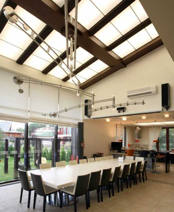 Гостиная, совмещенная со столовой, получается размером примерно 4 на 8 (или 5 на 7), а значит, потолок должен быть не меньше трёх метров, иначе будет психологически «давить». Но при этом остальные комнатки (кухня, спальни, подсобки, холл, топочная и т.д.) невелики, и могут быть ниже, 2.5 -2.7 м. Здесь наоборот, избыточная высота создаст эффект «колодца». И тут как раз «палочкой – выручалочкой» станет второй свет…