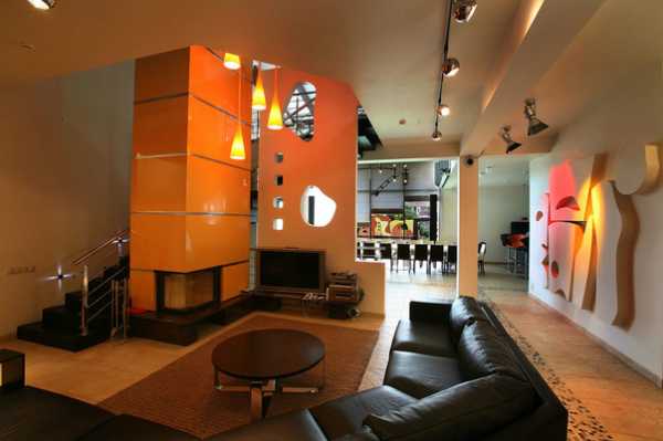 Каминная труба облицована оранжевыми глянцевыми плитами с металлическим рельефом. Такая художественная отделка еще и прекрасно отражает свет, делая помещение объемнее.