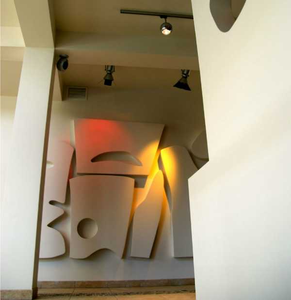 Абстрактные барельефы на стене – элемент современного искусства, превращающий обычный жилой интерьер в художественную галерею. Направленный свет – часть художественной инсталляции, поддерживающая теплую гамму каминной зоны.