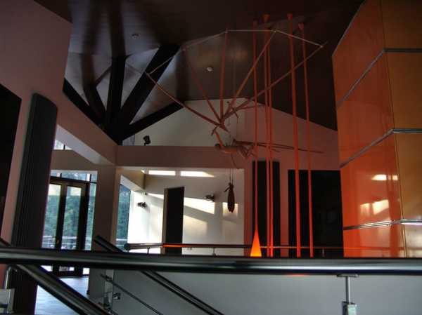 Потолок второго этажа – еще более экзотическое пространство. Веерообразные балки, темное дерево, полукруглые формы сами по себе создают сюрреалистическое впечатление. Оранжевая каминная труба и подвесы от ламп, свисающих на первый этаж – часть скульптурного оформления пространства. Вместо люстры под потолком – Икар, теряющий свои крылья.