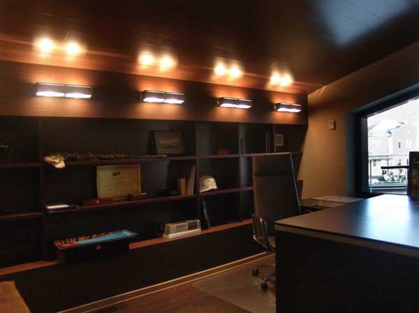 Кабинет выглядит как коробка, облицованная темным деревом: деревянный потолок перетекает в стеллаж, который становится полом. Только плинтус и подсветка на стене помогают определить границы поверхностей. Здесь царствует все тот же дух лаконичного модернизма – ничего лишнего, простые, прямоугольные формы. На стене вместо обоев – плитка.