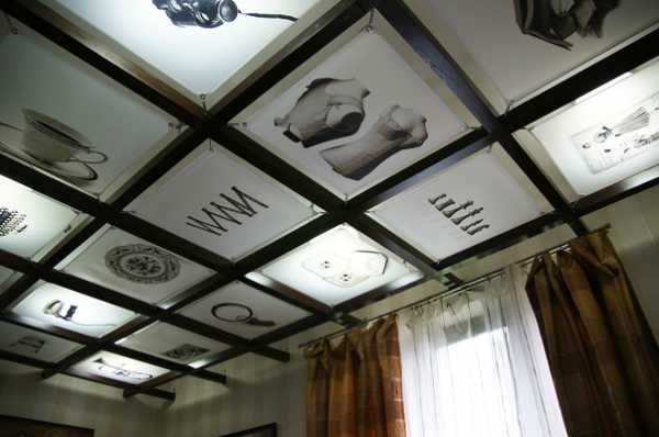 В деревянную решетку вставлены черно-белые рисунки на ткани – отсылка к предметам минувших эпох. Над подвесным потолком, невидимые глазу, расположились простые светильники. Свет от них, проходя через ткань, подсвечивает конструкцию, создавая иллюзию светящихся плафонов.