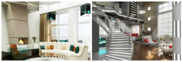 Чтобы усилить эффект освещенности помещения, лучше использовать в дизайне интерьера светлые и теплые оттенки. Но при таком обилии света сразу с нескольких уровней, даже холодные оттенки покажутся Вам мягкими и приятными.