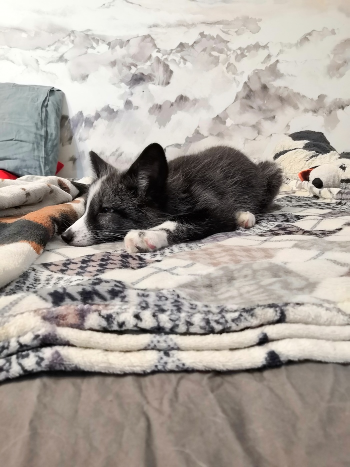 Принесли мы ее домой, мы, честно говоря, не знали что с ней делать, ведь у меня были коты… Я боялась за них. Но лиса достаточно спокойно отнеслась к котомордам. Пыталась с ними играть, они на нее пару раз зашипели и она к ним не лезла. Она нашла общий язык лишь с одним котиком, они очень хорошо подружились.