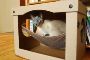 В картонной коробке вырезаем круглое или квадратное отверстие, закрепляем крышу, кладем на дно подстилку. Для пущей эстетичности обиваем или заклеиваем стенки плотным материалом в соответствии с оформлением квартиры. Можно соорудить целый замок из нескольких коробок, вырезав отверстия таким образом, чтобы подниматься на разные этажи.