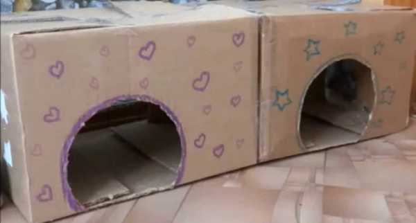 Для разнообразия можно порадовать домашнего любимца двух- или трёхэтажным жилищем. Для этого берут картонные коробки разных или одинаковых размеров. Склеивают их при помощи ПВА или двухстороннего скотча.