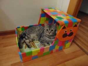Не забывайте, что такой вариант домика из коробки для кошек самый быстрый в изготовлении, но как минус – не долговечный.
