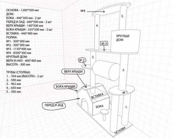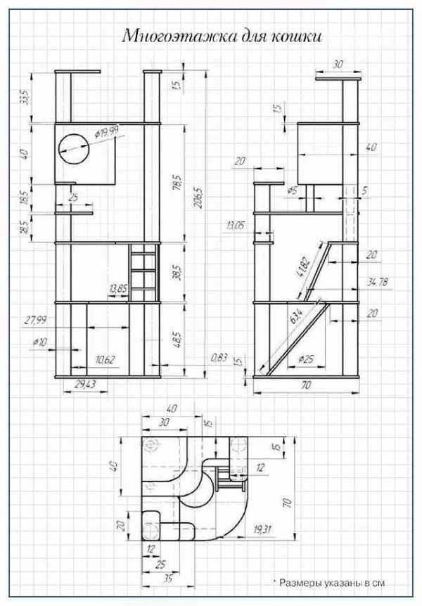 На схеме представлены только основные части кошачьего домика. Но к ним ещё могут быть добавлены когтеточки, столбики, по которым животное сможет лазить, дополнительные открытые лежанки. Если хозяева твёрдо решили сделать домики для кошек своими руками, чертежи можно заказать и у специалистов.