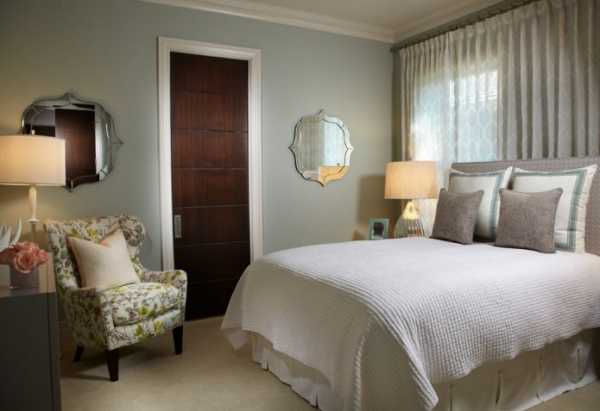 На фото спальня с отделкой стен пастельными однотонными обоями, белыми наличниками, которые подходят под текстиль, а темно-коричневая дверь является акцентом.