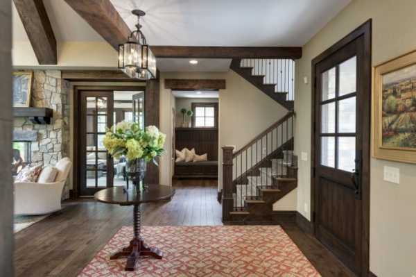На фото прихожая загородного дома, где вся деревянная отделка и ламинат по оттенку совпадает с цветом входной двери.