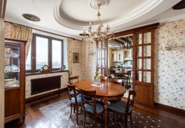 Для классического интерьера подойдет глухая дверь с резьбой, филенками из массива дерева. Для небольшой комнаты подойдет со стеклянной вставкой. Пышная фурнитура, золотые вставки, растительный узор характерны для стиля барокко.