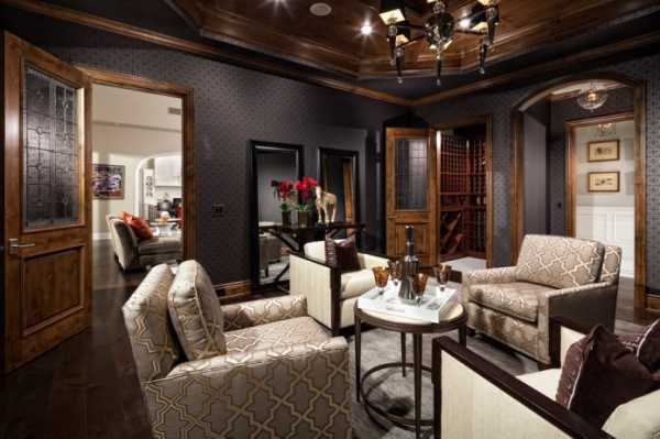 Темная дверь в гостиной будет сочетаться с бордовым, зеленым, золотым, бежевым интерьером в классическом стиле, а также с бежевым, белым в современном интерьере с яркими элементами декора. Если в гостиной есть два и более окна, тогда ее можно сделать полностью темной без опасения.