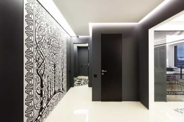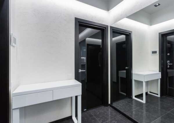 На фото ансамбль черных дверей в белом узком коридоре, где белая отделка стен, предметы декора и дополнительное освещение делают его праздничным.