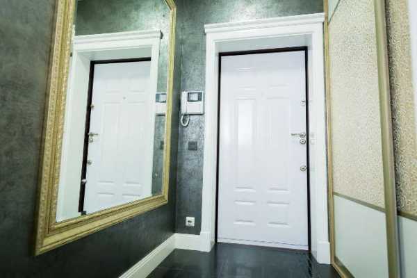 С помощью такого дизайнерского приема, получается сэкономить полезное пространство в коридоре и лишить необходимости в установке традиционного зеркала. Такой декоративный акцент, как отражающая поверхность, позволяет визуально облегчить дверь, делая ее менее массивной и тяжеловесной.