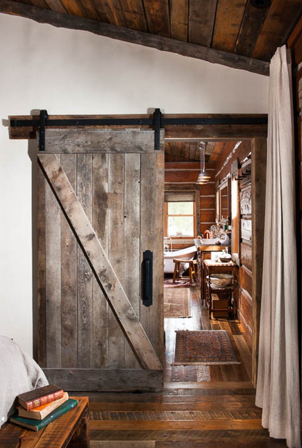 Раздвижная амбарная дверь, стена обшитая старой доской из восстановленной древесины, простой деревенский шкаф — дают ощущение истории и принесут загородную атмосферу в любое пространство.