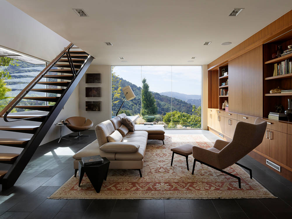 2. Гостиная или комната отдыха. Двухуровневый этаж в большой квартире позволяет скомпоновать угловую и П-образную функциональные зоны, и получить пространство для обустройства гостиной.