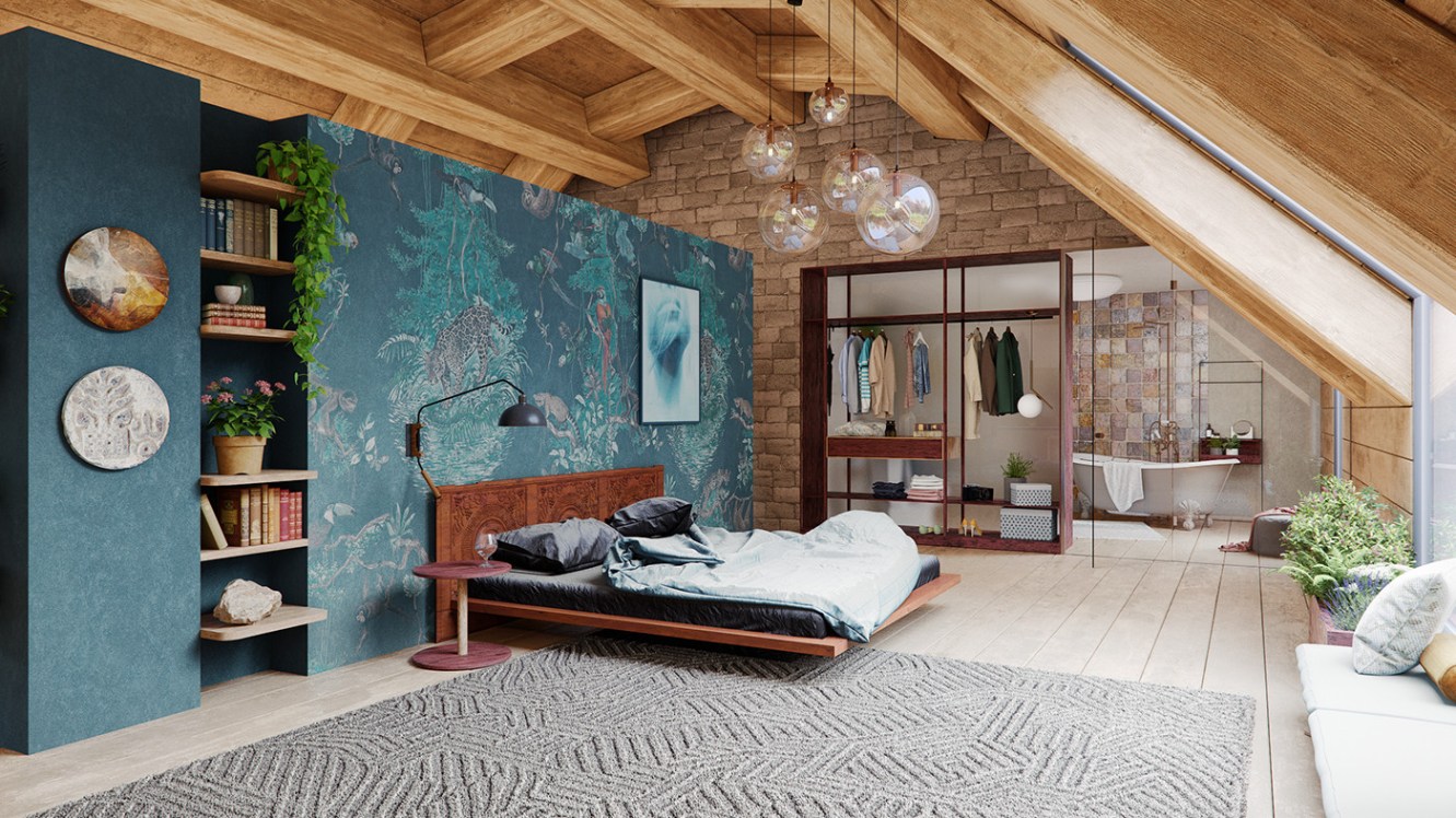 Вместе с ними используют штукатурный раствор и акриловые краски. Большое внимание уделяется дереву, которое создаёт ощущение домашнего тепла и уюта в спальне.