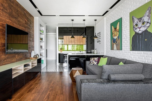 Гостиная. Каждая зона в студии выделена особенностями отделки стен, а в кухне также и пола, при этом композиция не утрачивает цельности. Шутливая деталь: кошачьи портреты помещены над диваном и как будто бы смотрят телевизор