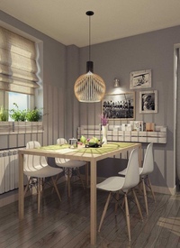 Красивым дополнением к такому обновлению стеклянные и хромированные элементы. Стол можно подобрать как из дерева, так и из стекла, а стулья — подходящими к нему по стилю. Неплохо будут выглядеть строгие цветочные горшки, ультрасовременные бра, небольшие модульные картины, жалюзи.