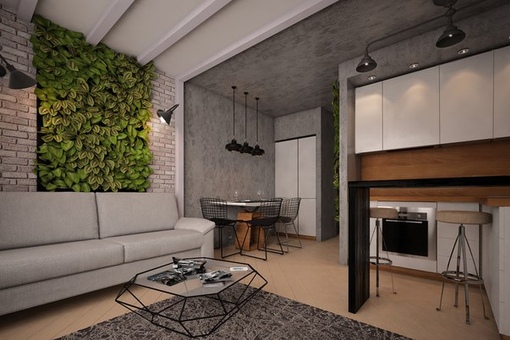 Квартиры в этом стиле часто превращают в студии, убирая все не несущие стены и объединяя все комнаты в одну. В ней применяется зонирование, чтобы выделять функциональные зоны. - Индустриальный облик интерьера. Визитная карточка стиля — кирпичная кладка, грубая штукатурка, трубы и металлоконструкции. Кирпичную кладку можно имитировать с помощью декоративных материалов, но без неё лофт не будет лофтом.