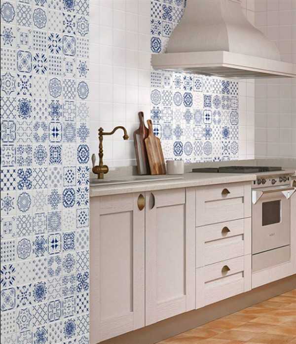 На первом фото мы выбрали в качестве отделки очень эффектную плитку в стиле «пэчворк», что означает шитье из лоскутов. Это очень модный сегодня стиль отделки и довольно распространенный в оформлении кухонных фартуков в стиле Прованс. Квадратная керамическая плитка небольших размеров, имеющая разные, не сочетающиеся между собой орнаменты. Цвета для плитки подбираем соответствующие стилю – голубой, синий, желтый, зеленый, теплый терракотовый и бежевый.