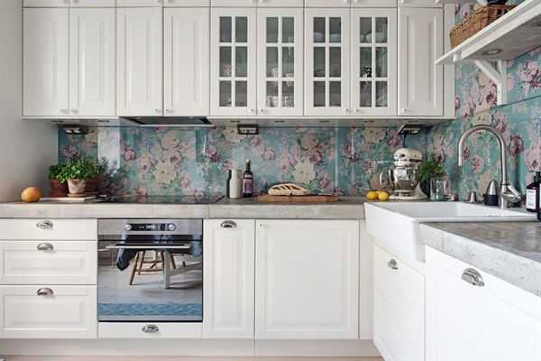 Если сама кухня выполнена преимущественно в белом цвете, для фартука можно выбрать почти любой оттенок. Он может быть лавандовым, зеленоватым, голубым или розовым, а также коричневым.