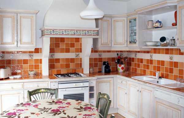 Обычно такую плитку красят в кирпичный оттенок, что уже создает быт старого провинциального дома. Правда, необязательно, что такой материал будет однотонным, рисунки и узоры также являются его неотъемлемой частью. Кстати, отделка кухонного фартука в стиле прованс – это большая ширина между плиткой, сделанной по технологии рустика. Таким образом, достигается винтажность обстановки.