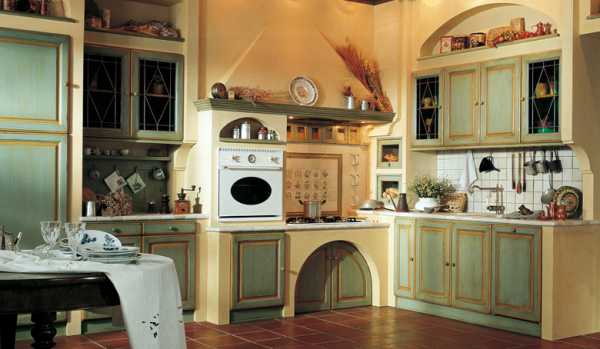 На прованской кухне нет нужды прятать в шкафы посуду и кухонную утварь. На открытых полках и в декоративных нишах самое место керамическим петушкам и коровкам, специям и соусам в расписных керамических баночках и бутылочках, плетеным корзинкам, связкам лука/чеснока и букетикам из полевых трав.
