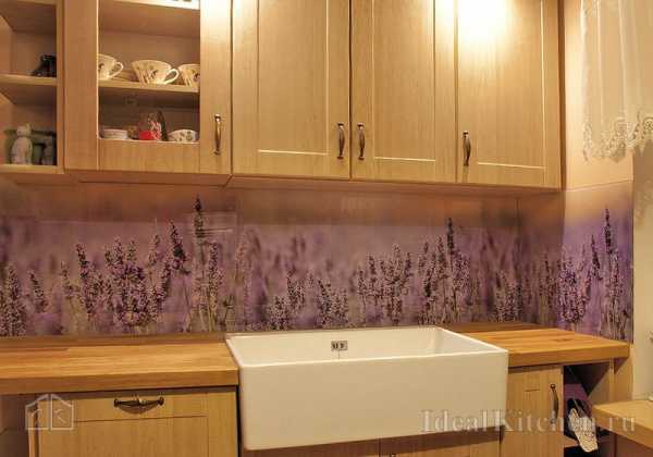 Для фартуков на кухню стиле Прованс выбирают светлые цвета, например, белый. Не стоит забывать о символе данного стиля — лаванде. Если это подходит к общему интерьеру, фартук можно сделать лавандовым или светло-зелёным. Иногда используют голубой. Прекрасным вариантом будет положить плитку белого цвета, периодически чередуя «чистые» участки с белыми плитками с рисунком лаванды. Подойдёт и другой цветочный узор.