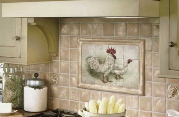 Главное действующее лицо кухонного интерьера – плиточный фартук. Здесь уже дизайнерскую фантазию ничто не ограничивает. Фартук можно выложить из однотонной плитки контрастного цвета, а можно украсить керамическими изразцами или плиточками с уникальными сюжетами. Также в центре на фартуке могут появиться целые картины из деревенской жизни, которые складываются из нескольких рядов керамической плитки.