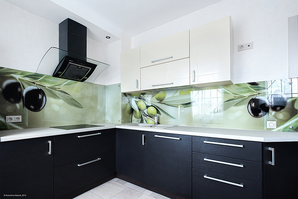Стеклянные фартуки научились совмещать с цветной печатью. Любое изображение, выбранное вами, может украсить комнату. Закаленное стекло может выдержать любые воздействия, но благодаря картинке они будут незаметными.