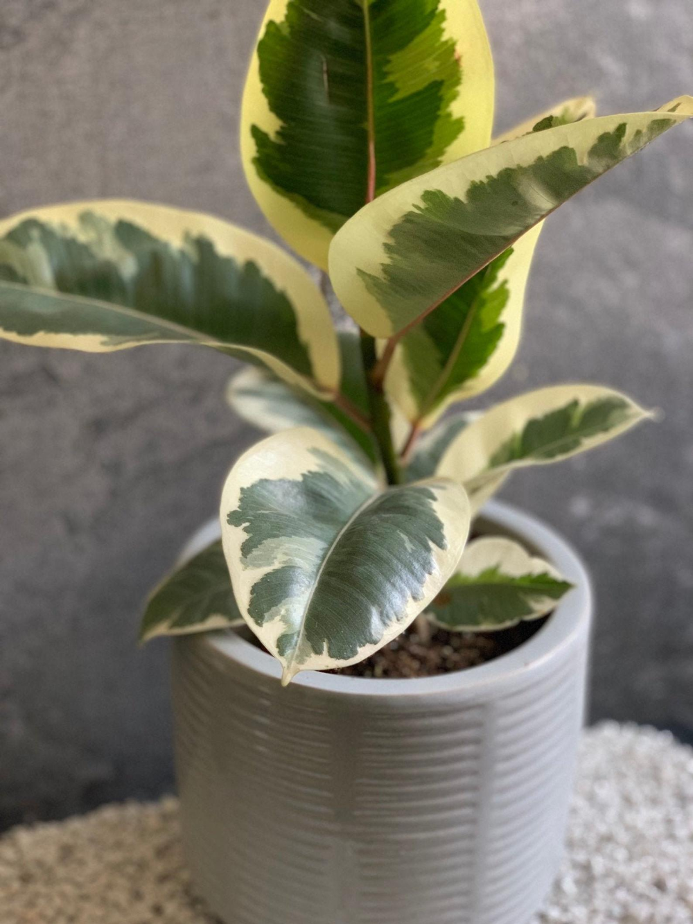 Треугольный фикус невысокий, 30 см в высоту с белой окантовкой листьев.