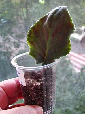 Лист необходимо промыть под тёплой водой и удалить с него остатки влаги. Черенок листа срезается под острым углом (лучше всего 45°) и помещается в горшок с субстратом. Желательно обмотать горшок с листом при помощи полиэтиленового пакета.