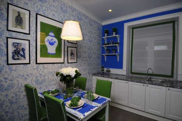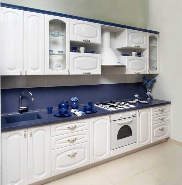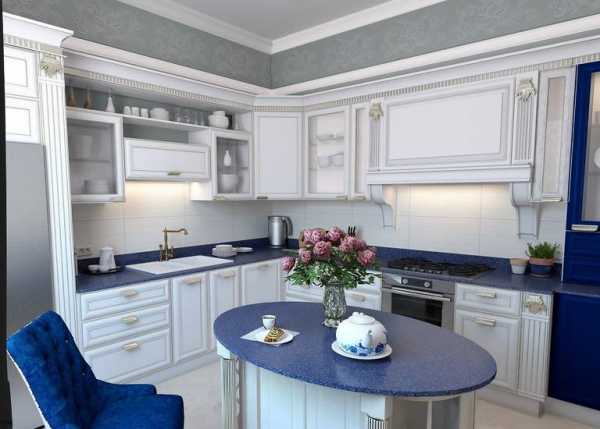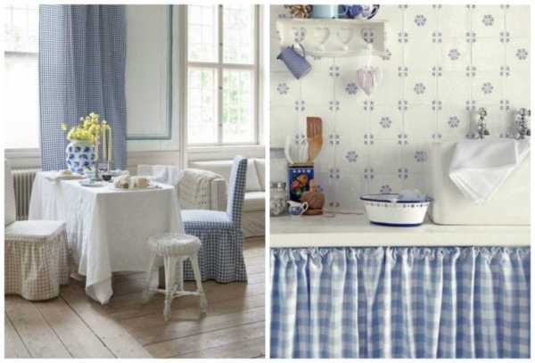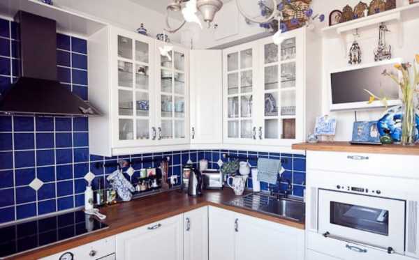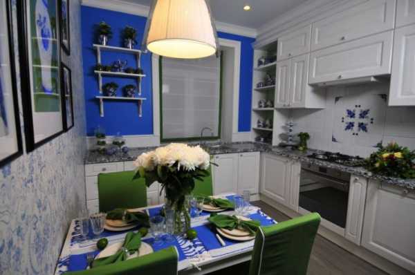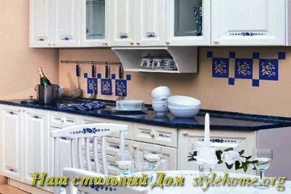 Если же не уверены в своих дизайнерских способностях, попробуйте одну из проверенных схем: белые стены с тонкой синей росписью, нейтральный пол (коричневый или бежевый), гарнитур с белыми украшенными фасадами, светлая мебель и бело-синие шторы. Ну, и конечно же, соответствующая фарфоровая посуда.
