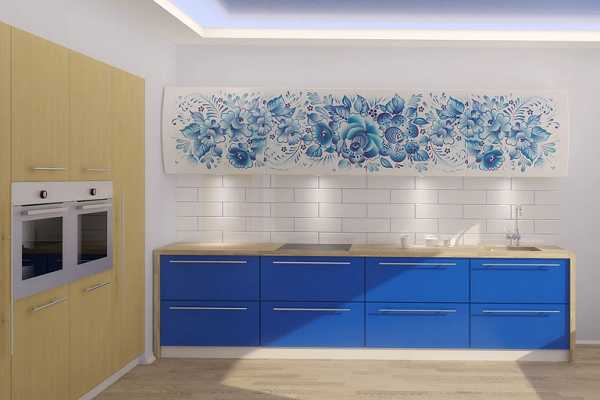 Важно! При разработке дизайна не всегда нужно использовать орнаменты повсеместно, с ними можно сильно переборщить. Исключить это поможет применение акцента гжели на стене или мебельном фасаде.