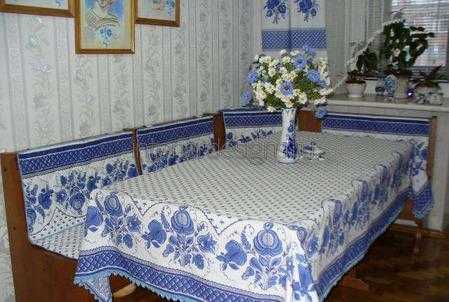 — скатерть и шторы на окнах синие однотонные, близкие или совпадающие с цветом гарнитура;