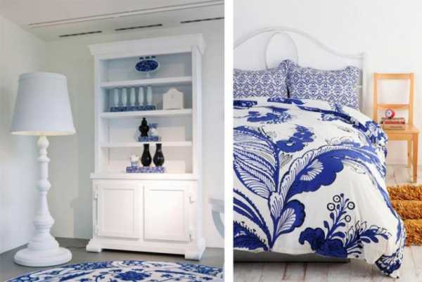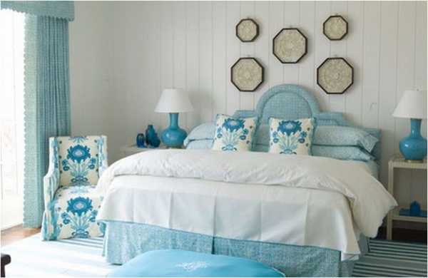 Белизна на текстиле выглядит свежо и модно, а неяркий голубой цвет добавляет нежность и уют. Так как цвета достаточно холодные, с ними действовать нужно аккуратно, чтобы в спальне не было дискомфорта.