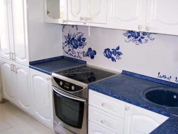 Гжель. Интересные завитки орнамента известны каждому русскому человеку. Сочетания голубого с белым идеально подходят в дизайн кухни.