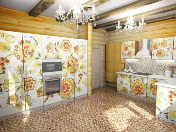 Хохломские орнаменты хорошо впишутся в кухонный интерьер, а атмосфера в помещении станет намного уютней.