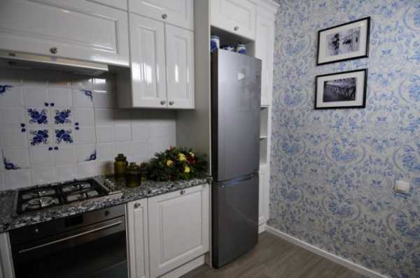На стенах кухни нашего проекта имеются обои, которые сделаны под гжель. Довольно милые и простые по рисунку, они дополнят наш бело – голубой интерьер.