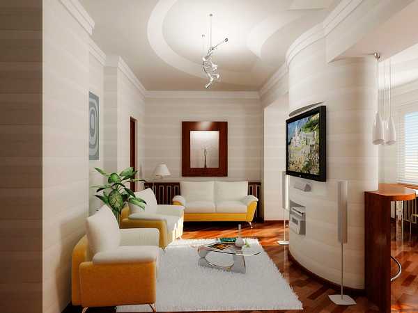 - для визуальной перепланировки помещения достаточно правильно расставить предметы интерьера. Можно комнату разделить на две зоны, к примеру, отгородить небольшую часть для спальной при помощи модульной мебели. А соответствующая отделка позволит все это организовать грамотно и вполне гармонично;