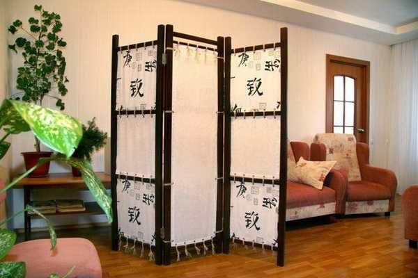 В качестве практичного способа преобразования квартиры в двухкомнатную можно использовать ширму. Плюс этой перегородки состоит в том, что она переносная и ее всегда можно установить в любое место комнаты. Можно подобрать перегородки разных форм и стилистического вида. Поэтому можно с легкостью подобрать ширму, которая будет идеально вписываться в дизайн всего пространства. Ширму можно применять для отделения зоны отдыха, места для ребенка, встречи гостей и так далее. Как правильно расположить этот предмет и как декорировать, можно наглядно увидеть на многих фото, на которых представлены примеры такой квартиры.