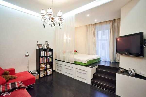 - для выделения зоны отдыха и сна можно сделать небольшой уровень, на котором будет установлена кровать или диван;