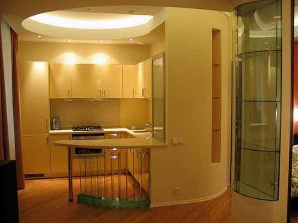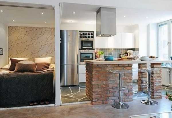 - если нет возможности устанавливать ширму, то можно кухонную и гостиную зоны разделить при помощи барной стойки. В результате можно получить стильное разделение и небольшой столик для обеденной зоны;