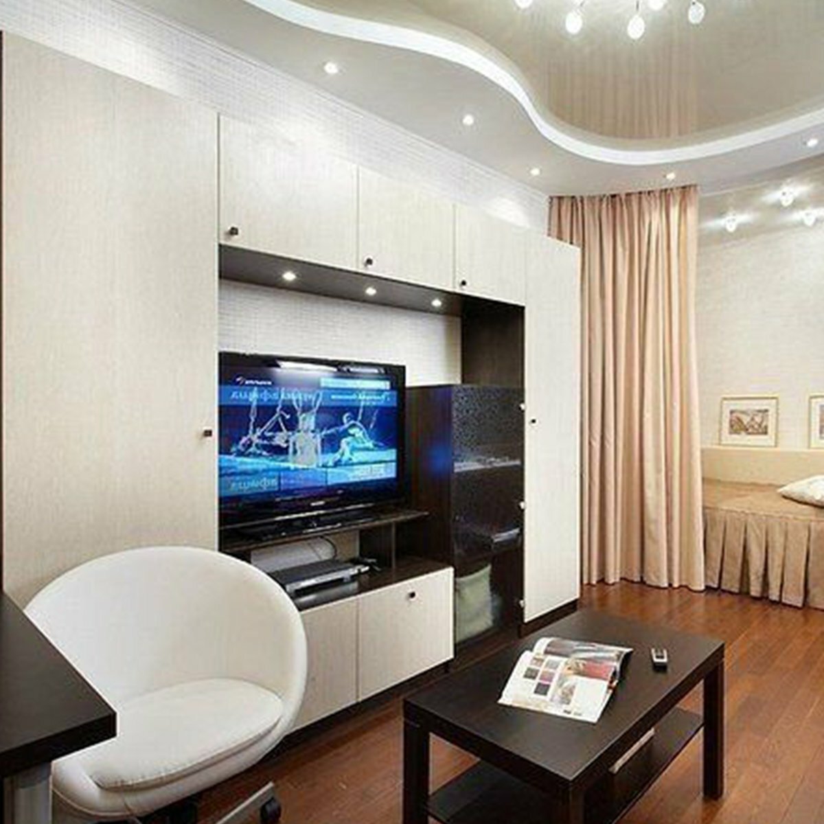 Материалы для потолка, напольные покрытия и обои для комнаты в однокомнатной квартире – фото