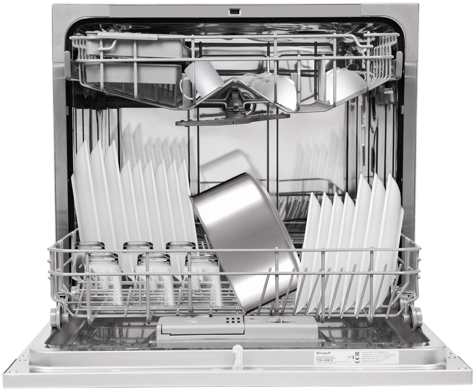 Компактная посудомойка имеет габариты чуть больше обычной микроволновки. Ее ширина и глубина составляют 40 см, высота 50 см. Она маленькая, не занимает много места, идеальна для молодой семьи из двух человек.