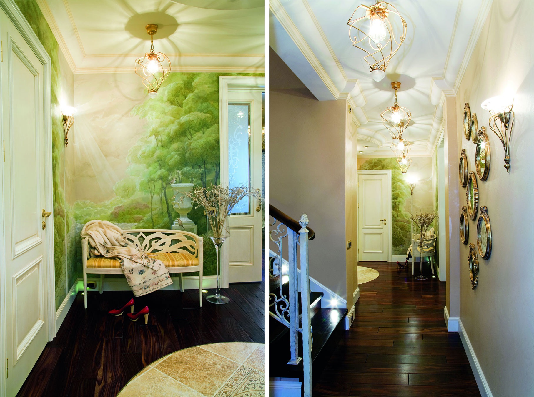 - детали рисунка могут быть размещены на одной или двух стенах: это зависит от площади прихожей и присутствия свободного места;