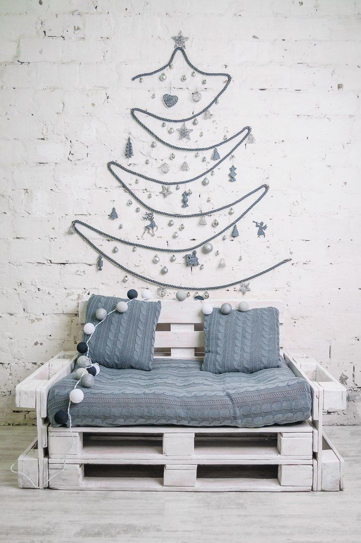 - В стиле лофт можно оформить чудесную елочку из гирлянд на выставленной у стены палете. Она станет фоном для фотозоны.