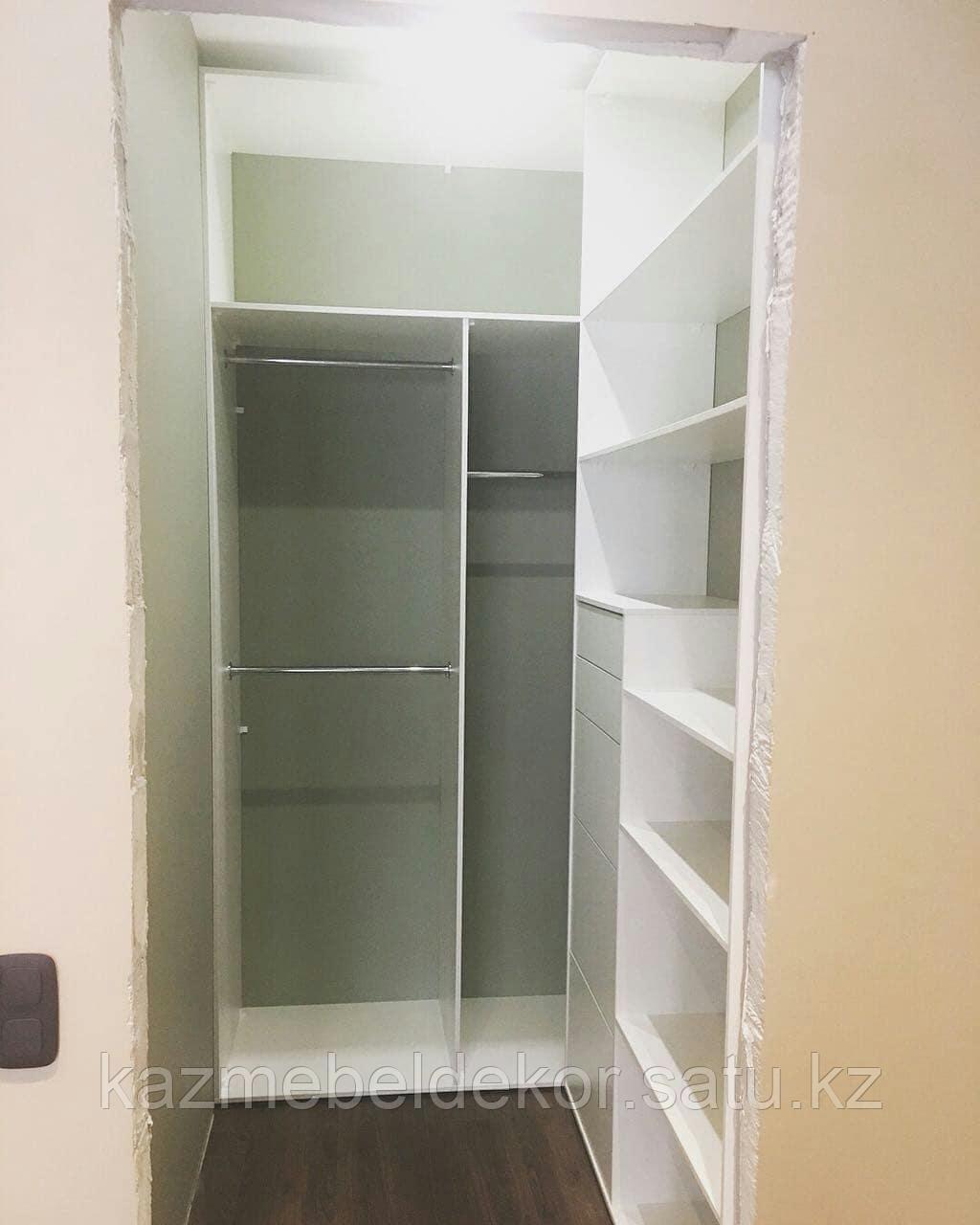 Пригодится хороший угловой шкаф, но он должен быть от пола до потолка. Его можно сделать закрытым, с зеркалом в полный рост на двери. В таком шкафу легко расположится сезонная одежда и костюмы, останется место для полок и нескольких выдвижных ящиков.