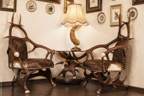Более сложное дизайнерское решение — это мебель из лосиных или оленьих рогов. Тут самостоятельно, конечно, не справится, но можно найти готовое решение или сделать стол и пару стульев на заказ. Стоить будет не дешево, кто бы спорил, но выглядит это действительно очень эффектно.